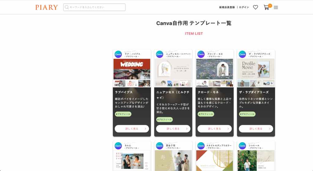 結婚式の準備アイテムを幅広く取り扱うPIARYでも、Canva対応のプロフィールムービーテンプレートが豊富に展開されています。デザイン性が高く、操作も比較的簡単なため、一定の人気を集めています。
